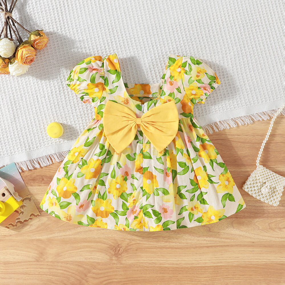 ग्रीष्मकालीन नए बेबी गर्ल्स ड्रेस बुलबुला आस्तीन बुलबुला आस्तीन स्क्वायर कॉलर बिग धनुष छुट्टी शैली मिठाई राजकुमारी पोशाक छुट्टी शैली