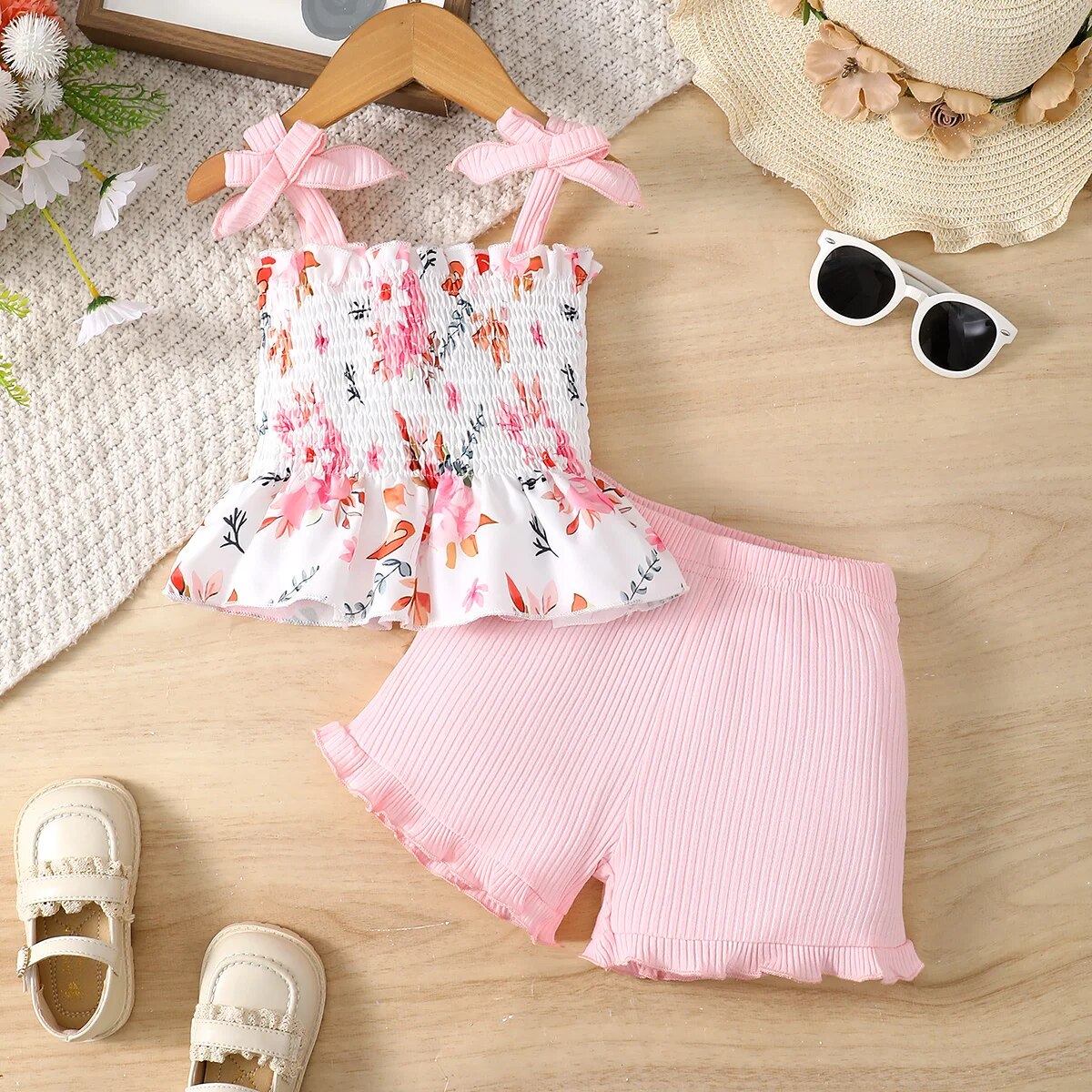 2 Pcs Summer Girls Camisole Floral Top Lace Shorts Casual Suit Sweatshirt Suit For Party Outdoor