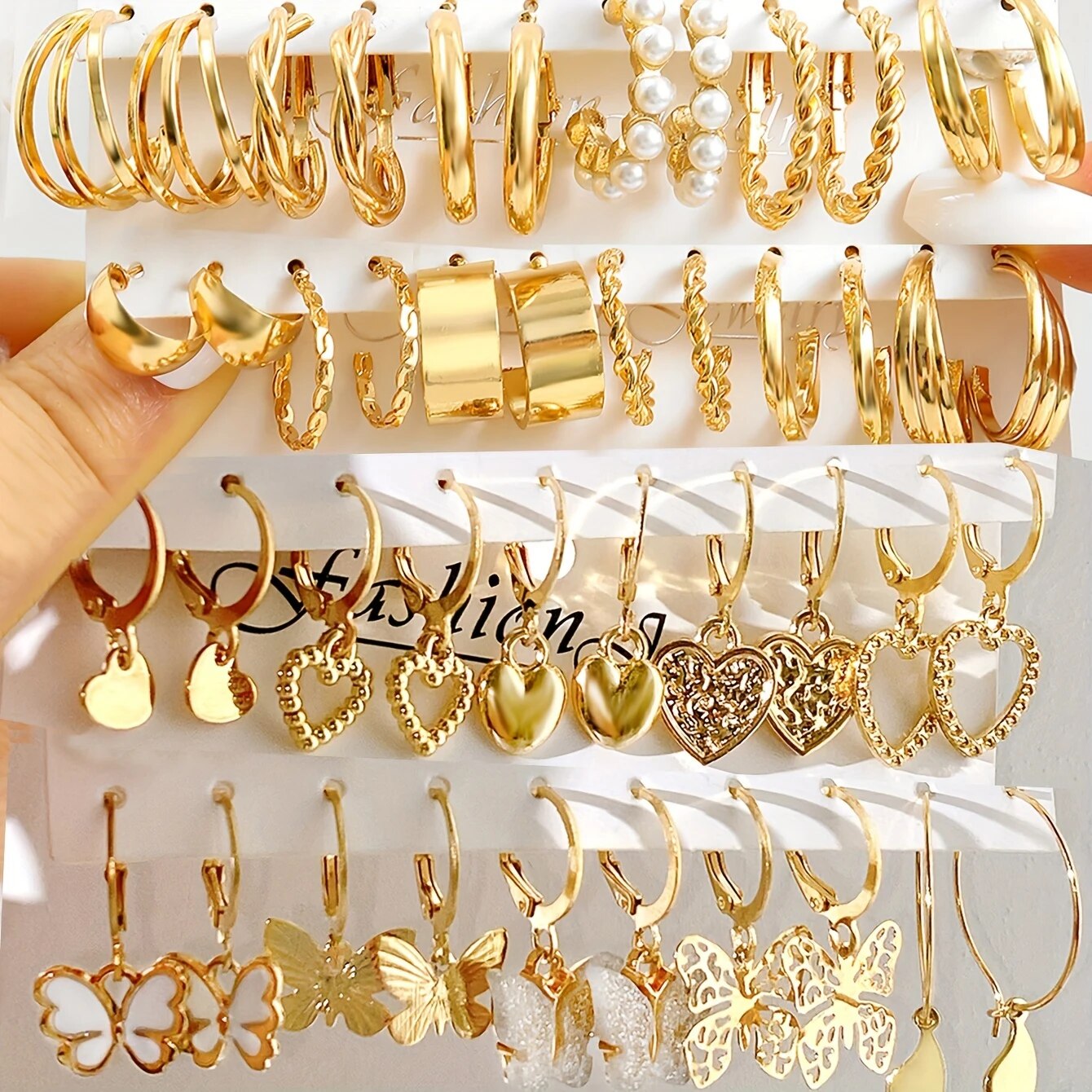 24 PairsSet Golden Fashion Elegant Metal Wide Gloss Hollowed Butterfly Heart Pendant Earrings For Women Daily Gift Accessories