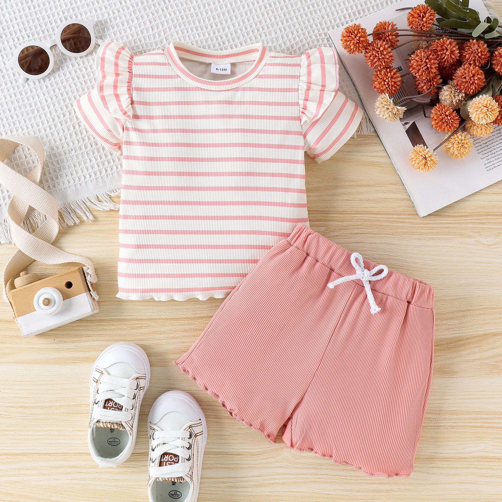 2PCS Summer Baby Girls 0-5 Years Old Soft And Comfortable Two-Color Striped Short-Sleeved Top Plain Shorts Casual Suit