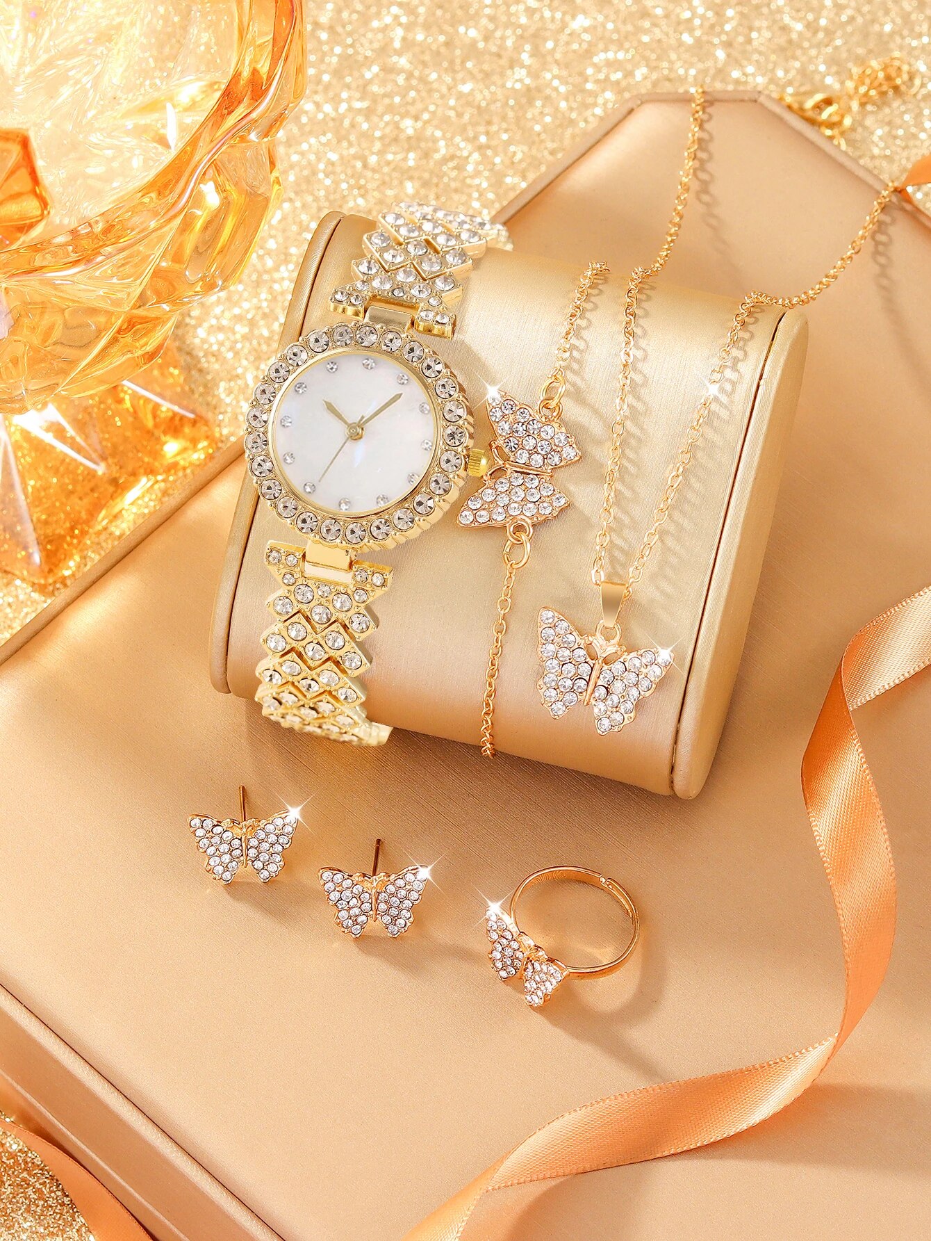 6Ps Womens Fashion Trend Luxury Luxury Rhinestone Roman Shell Quartz Watch Butterfly Rhinestone Necklace Ring Bracelet Gift Set
