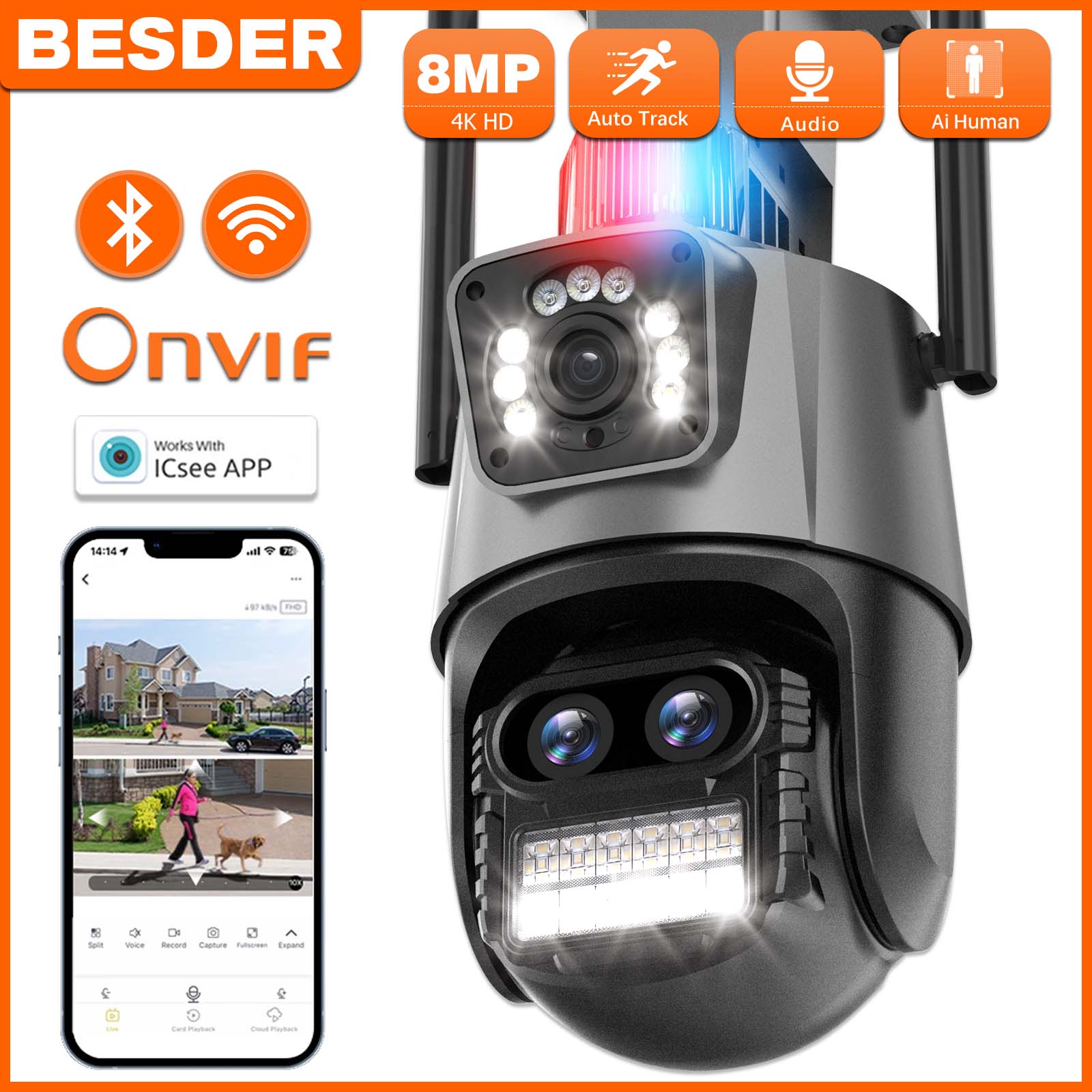 BESDER 9MP 4K PTZ Wifi Camera Three Lens with Dual Screen Multiple Ai Human Detect Wireless Outdoor Surveillance CCTV Camera|