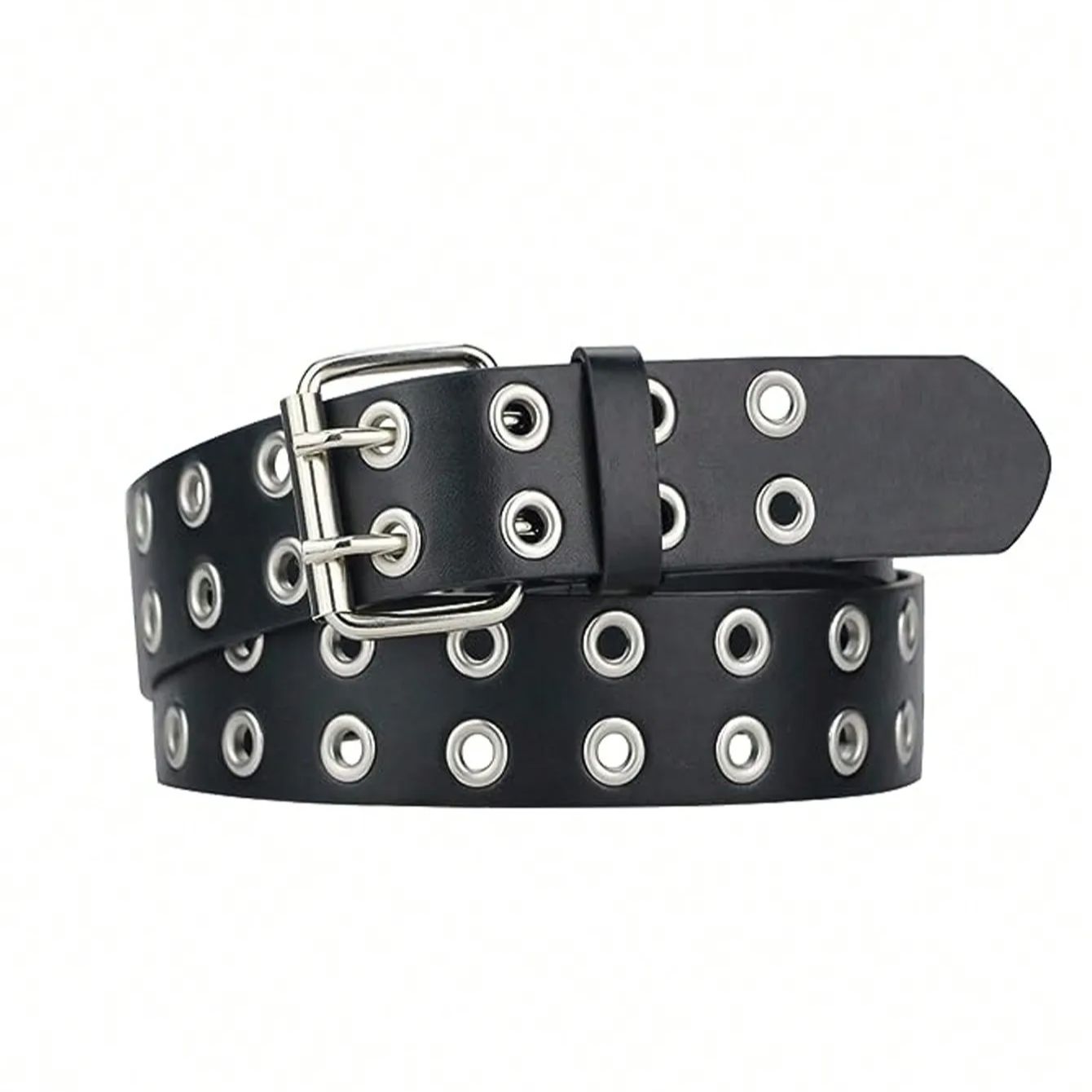 Black punk style personality Fashion belt Double riveted hole belt Black Metal Adjustable size for women men 110cm long
