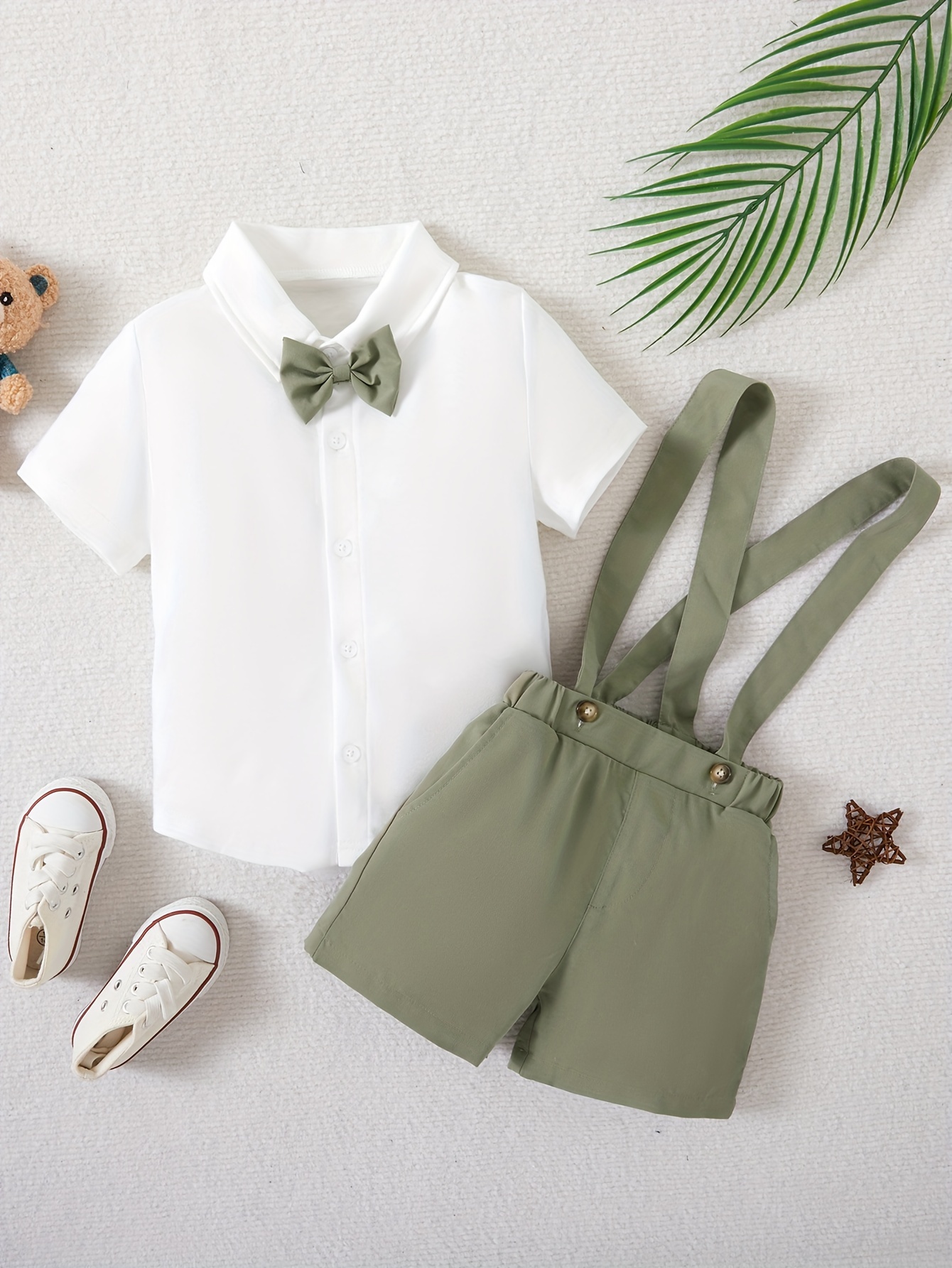 Boys Summer Set Bow Short sleeved Shirt and Strap Shorts Party Birthday Performance Gentleman Dress Set