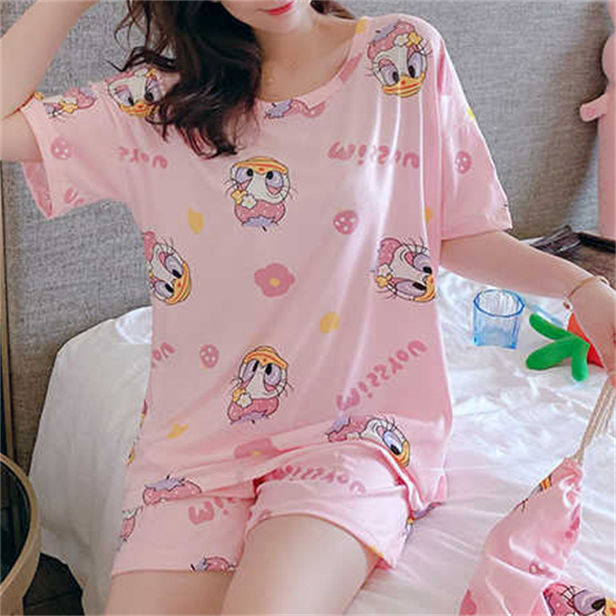 hibobi Women Summer Loose Plus Size Sweet And Cute ShortSleeved Shorts Can Be Worn Outside Korean Style Home Clothes Set