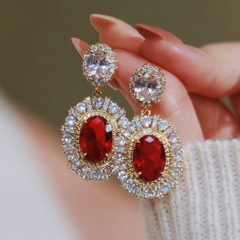 Huitan Aesthetic Gold Color Red CZ Hanging Earrings for Women Full Bling Iced Out Wedding Party Luxury Accessories Trend Jewelry