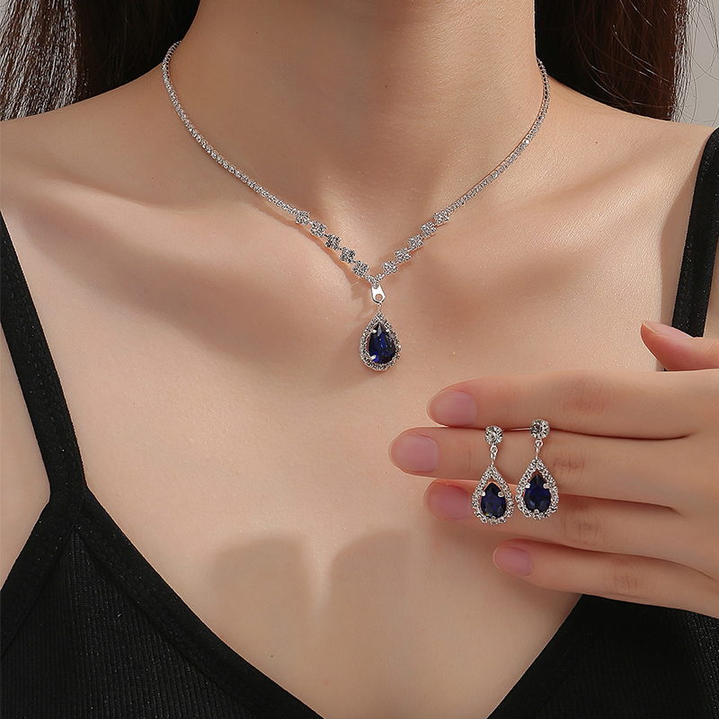 Obega 2 Pcs Set Blue Crystal Stone Denpent Necklace Earring With Dazzling Cubic Zircon Romantic Daily Wear Jewelry Girl Gift