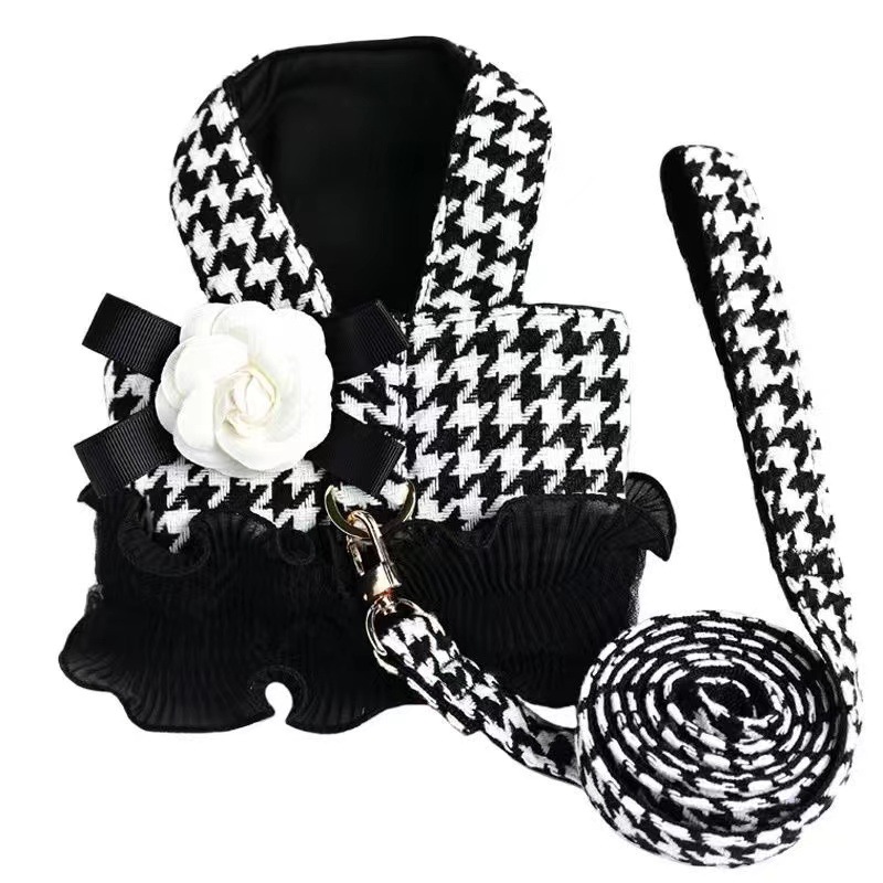 Pet dog, cat clothing, small fragrant wind, thousand bird grid traction suit, teddy bear, tank top style dog leash for walking|