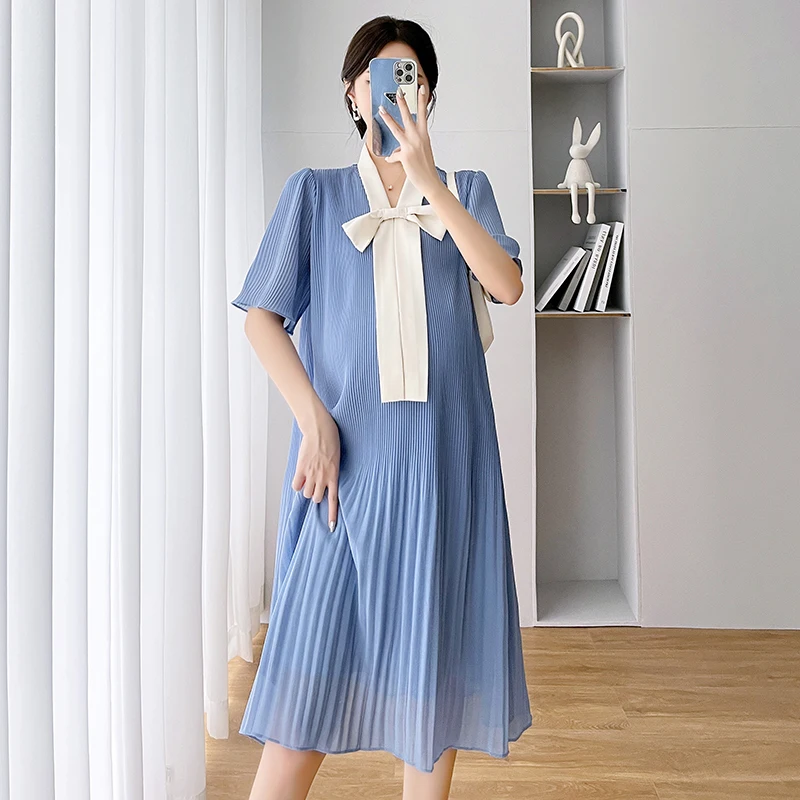 Summer Korean Fashion Chiffon Maternity Dress Elegant Sweet Loose Clothes for Pregnant Women Ins Ruffle Bow Pregnancy Clothing