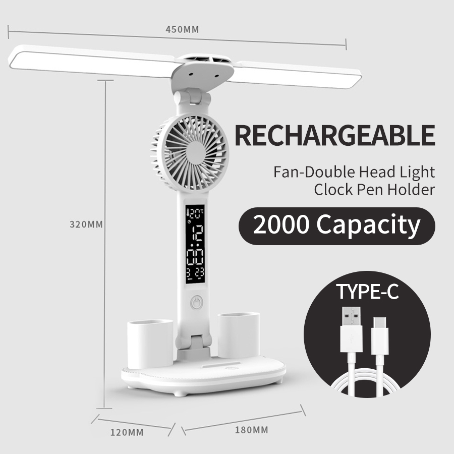 Table Lamp LED Double-headed Multifunction Foldable Touch LED Clock Table Lamp With Fan USB Chargeable Dimmable Reading Lamp