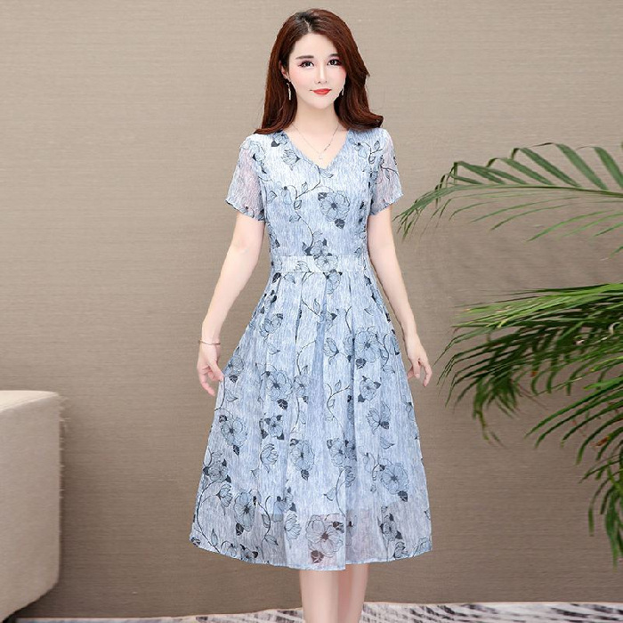 VNeck Fresh Color MidLength Dress Tight Waist Slimming A Line Dress 2020 Summer Large Size Womens Dress