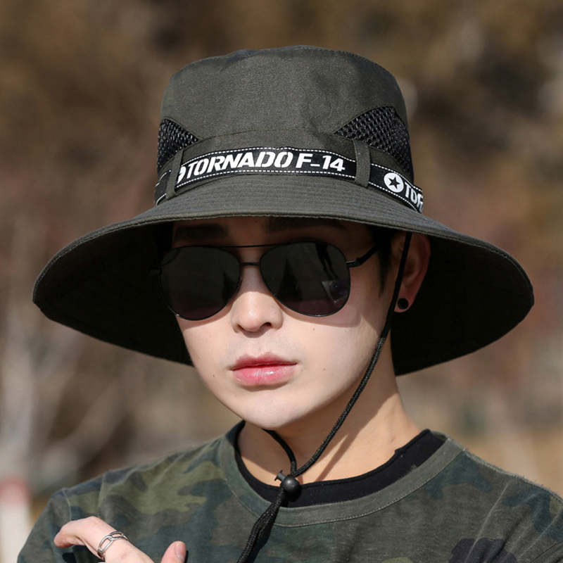 Windproof Men Outdoor Hat Wide Brim Flat Top Men Camping Hat Letter Print AntiUV Strap Hollow Out Men Fisherman Hat Headwear