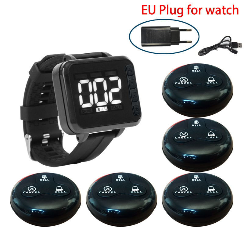 Wireless Calling System Restaurant Waiter Pager 1 Vibration Watch Clock 5 Waterproof Bell Button Hookah